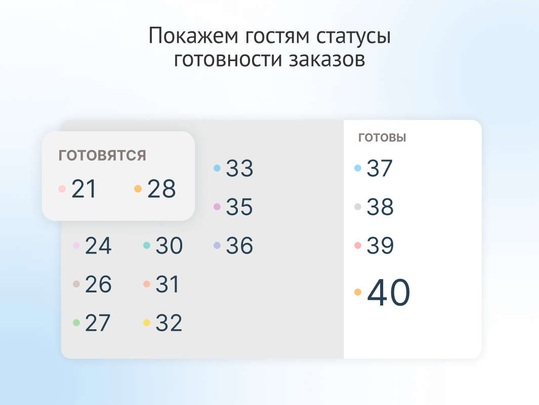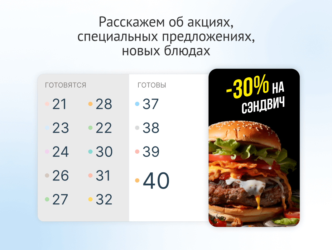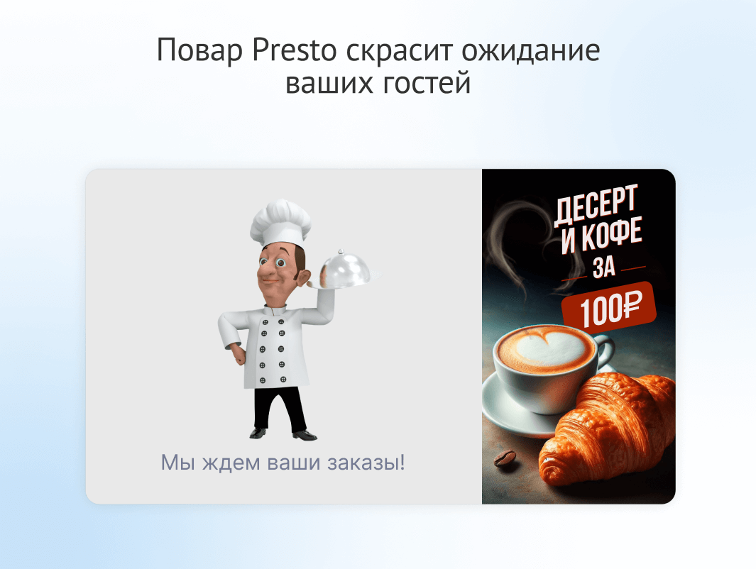 Система присвоит каждому заказу номер. Гости на телевизоре увидят, что еще готовится, а что можно забрать. Вы можете добавить на экран рекламу. Если заказов нет — покажем заставку с поваром Presto. Телевизор приобретается отдельно. Лицензия действует на заведение.