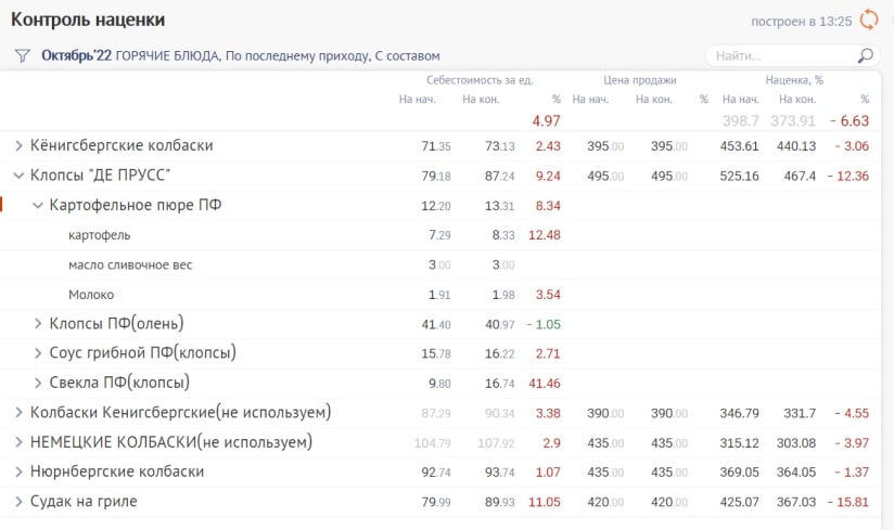 Программа сама ведет всю аналитику, поэтому может автоматически собрать любой отчет, например «Контроль наценки». Он показывает, что происходит с себестоимостью блюда в данный момент. Если цена окрашена в красный — она повысилась, если в зеленый — снизилась. Можете одним нажатием раскрыть состав блюда и посмотреть, какой именно ингредиент поднялся в цене и в каких блюдах он еще используется. Это поможет вам решить, что делать с меню: менять техкарту, искать другого поставщика или поднимать стоимость для гостей.