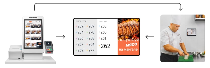 Часть клиентов уходит из заведения, если видит очередь на кассе. Чтобы не терять их, рекомендуем поставить терминал самообслуживания. Гости будут сами отправлять заказы на кухню и следить за готовностью на табло электронной очереди. Терминал заменяет 2‑3 сотрудников на кассе, поэтому помогает экономить на зарплате.