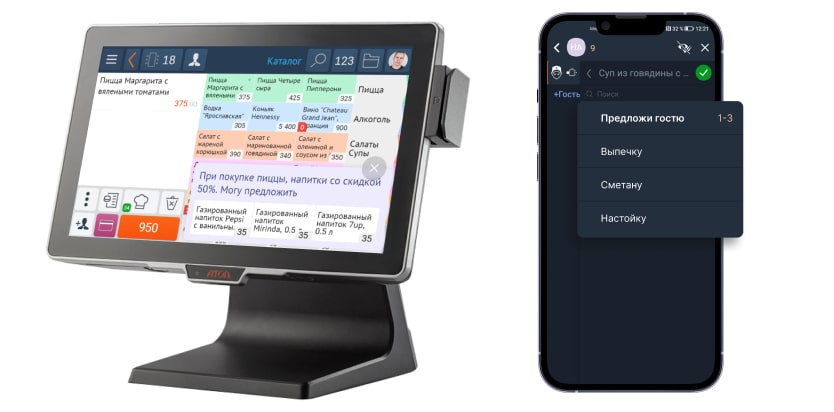 Чтобы упростить работу с дополнительными продажами, мы создали в приложении для официантов систему подсказок. Например, когда официант вносит в заказ борщ, программа напоминает ему предложить сметану, хлеб или фирменную настойку. Так он не забудет сделать допродажу и покажет гостям хороший сервис.