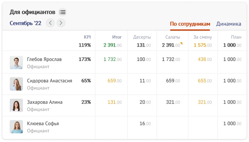 - Вне зависимости от того, какой способ учета рабочего времени вы выберете, программа сама заполнит рабочие табели и рассчитает по ним зарплату и KPI. Например, если выберете блюда с высокой маржинальностью и настроите на них дополнительные проценты, то за каждый закрытый чек официанту автоматически начислится премия.
