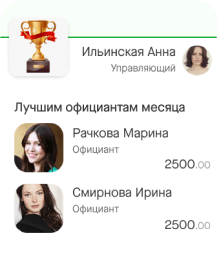 Мотивация персонала. Для официантов можно подготовить план по продажам и выставить индивидуальный процент на высокомаржинальные позиции. KPI и выплаты они смогут отслеживать прямо в приложении.