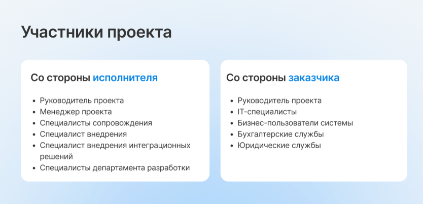 Для успешного внедрения необходимо сформировать внутреннюю команду проекта в вашей компании. Это важно еще и для того, чтобы вовлечь в процесс внедрения всех стейкхолдеров, учесть их пожелания и превратить в амбассадоров.