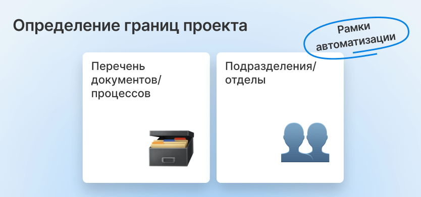 Здесь есть много нюансов. Например, бизнес хочет сначала внедрить КЭДО в одном отделе, а потом раскатать это на всю компанию. Или готов внедрить КЭДО во всей компании, кроме одного конкретного подразделения. Кейсы бывают разные, самое главное на этом этапе — очертить рамки автоматизации кадрового документооборота. Аналогично обстоит дело с документами и бизнес-процессами.