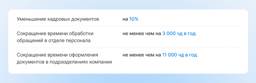 Любая автоматизация процессов, в том числе переход на КЭДО, должна привести в первую очередь к оптимизации расходов. Но это не единственный возможный результат. Вот пример критериев успешности внедрения КЭДО от одного из клиентов Setty. Кстати, эти KPI были перевыполнены после внедрения: