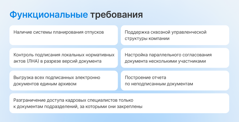 Вот пример самых частых функциональных требований к КЭДО от клиентов Setty: