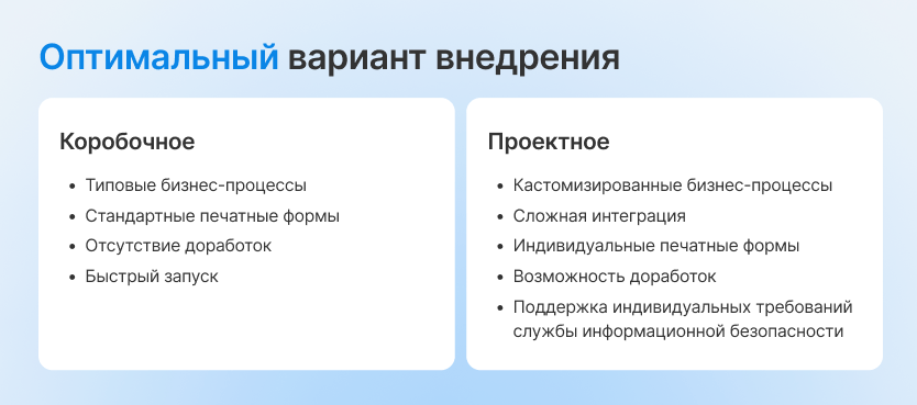 Существует 2 основных варианта внедрения КЭДО — коробочное и проектное. У каждого из них есть свои особенности: