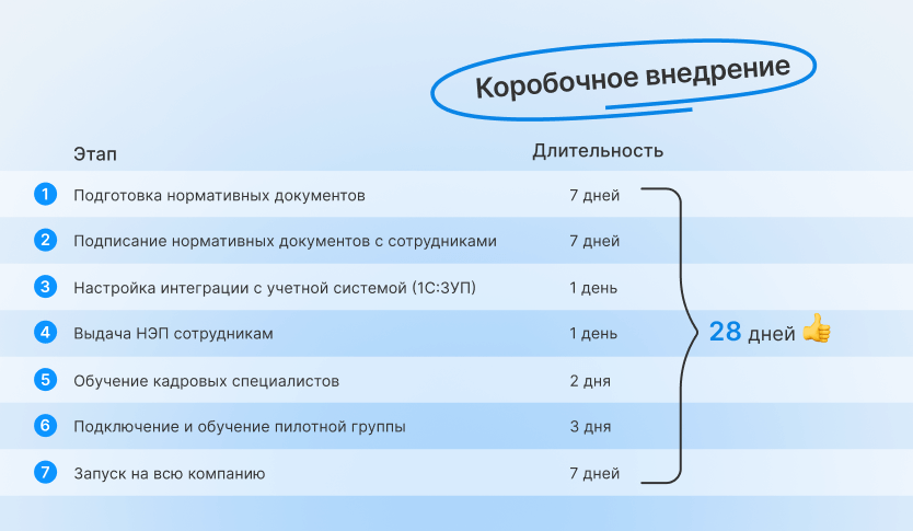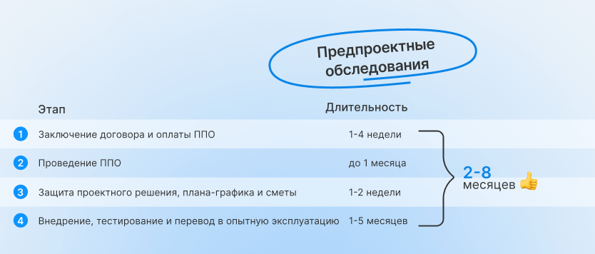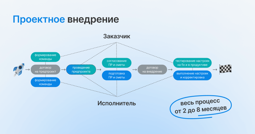Сроки внедрения зависят от множества нюансов: от размера компании до сложности бизнес-процессов. Вот так примерно может выглядеть расчет сроков: