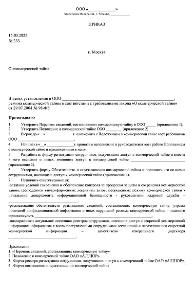 Также рекомендуем отдельно оформить список актуальных документов, содержащих коммерческую тайну, и список сотрудников, которым был выдан доступ. В случае обновления документов или увольнения сотрудников актуализировать такие списки проще, чем положение.