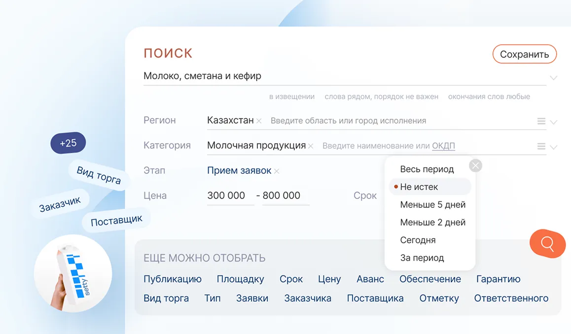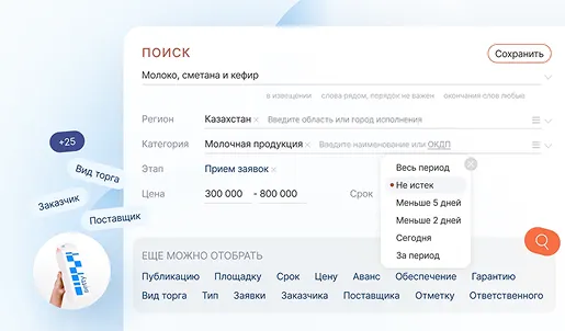 Добавляйте интересные лоты в избранные закупки из любого поискового запроса и работайте с ними отдельно от общей выдачи